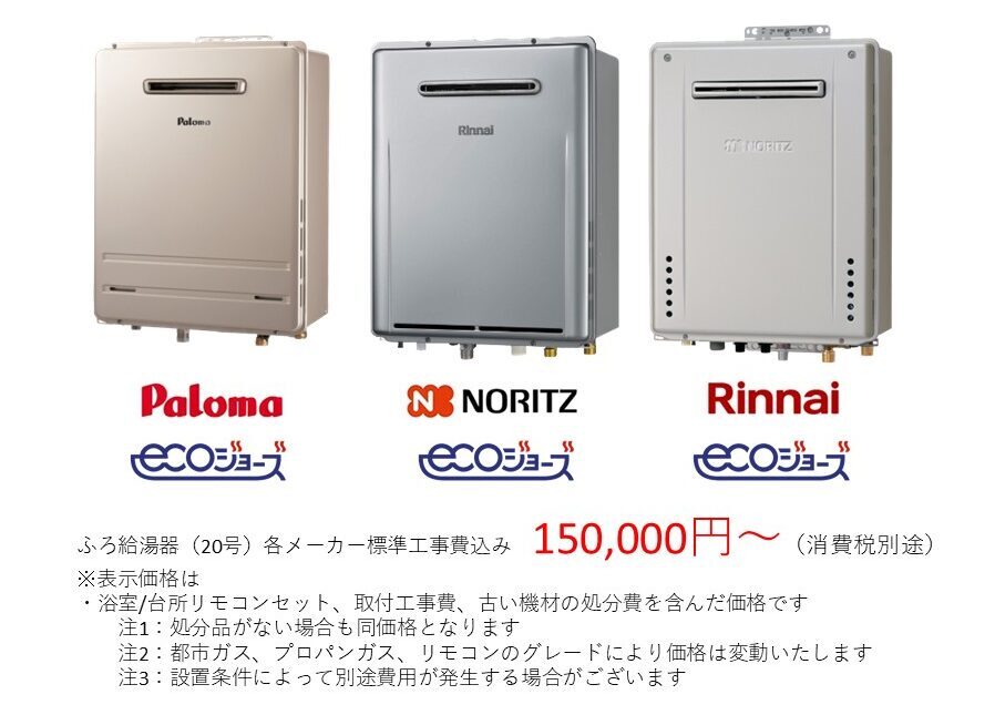 各メーカーのふろ用20号オートタイプ給湯器が標準工事費・キッチンと浴室のリモコンセット、さらに古くなって取り外した機器の撤去処分費も一切含めて15万円から。